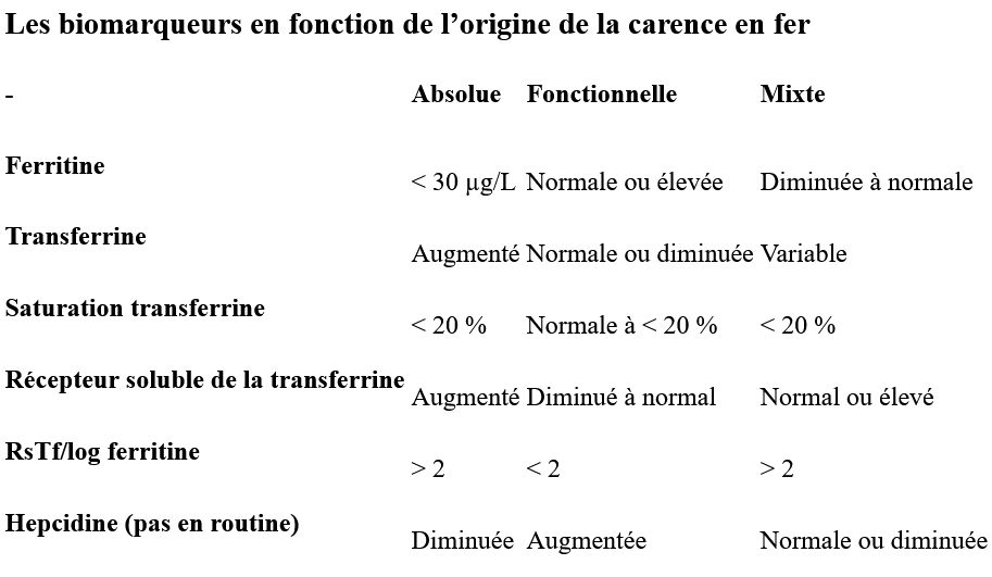 Carence si ferritine < 100 ou < 300 si le coefficient de saturation est < 20%. Cela permettrait de réduire le nombre d'hospitalisation (1).